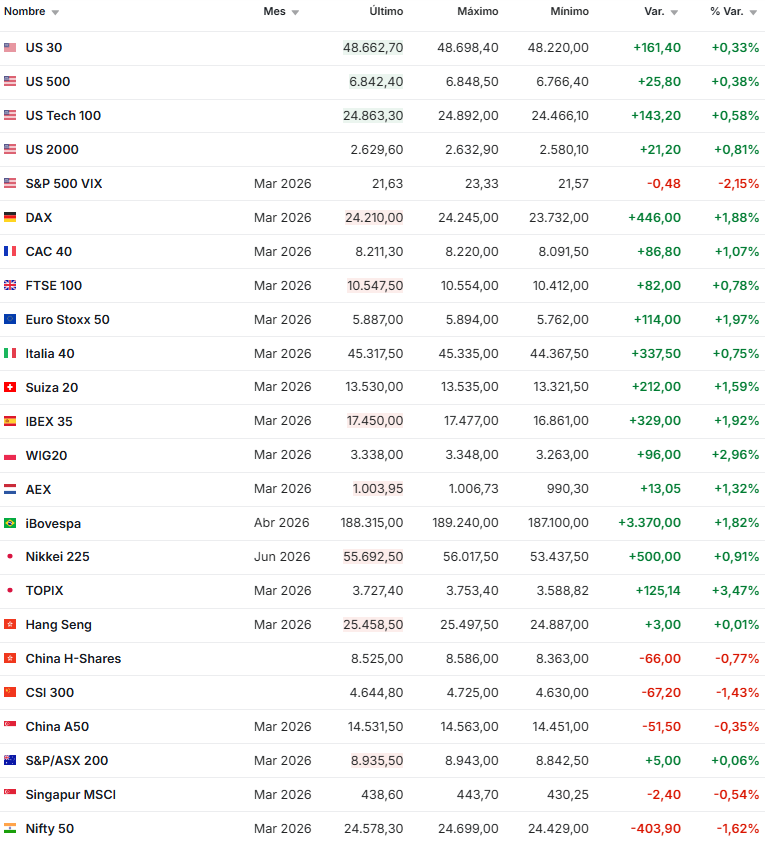 EEUU Luego de una intensa jornada el día de ayer, la venta masiva de acciones se detuvo luego de que Donald Trump mencionará que ofrecerá seguros para garantizar el flujo de petróleo con el fin de prevenir la posible crisis energética derivada por la operación Furia Épica. El rebote se da luego de que trascendiera que Irán habría iniciado contactos indirectos con EE.UU. para negociar el fin del conflicto, lo que modera parcialmente la aversión al riesgo.